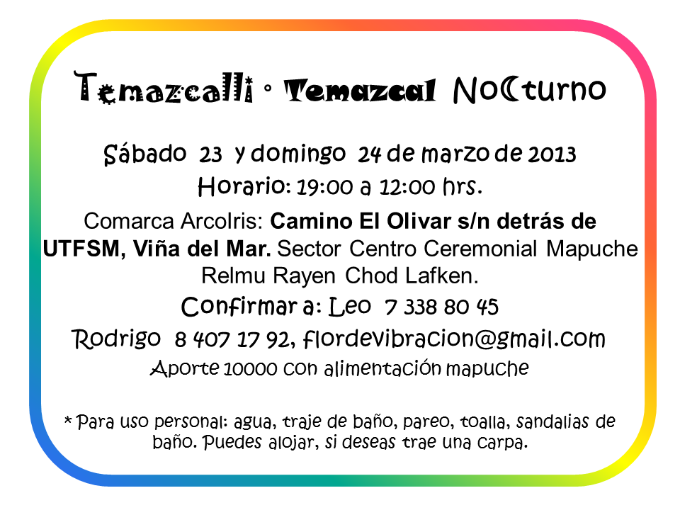 El horario de llegada es a las 19 hrs del día 23 de marzo y el de finalización es a las 12 pm del día domingo 24. El centro ceremonial se ubica en Camino El Olivar s/n, Viña del Mar en el interior del Centro Ceremonial Mapuche. Como aporte solicitamos 10000 pesos por persona, lo que incluye alimentación.